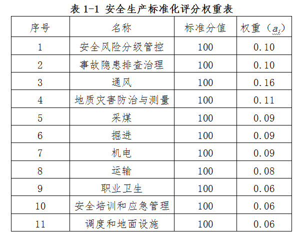 第十八条  煤矿安全生产标准化考核满分为100分,采用各部分得分乘以权重的方式计算,各部分的权重见表1-1。